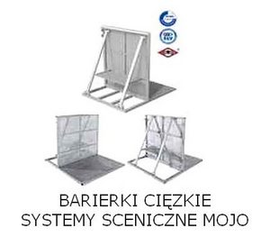 Barierka ciężka MOJO z podestem z blachy anty poślizgowej i odpowiednimi wyporami, zapewnia maksimum bezpieczeństwa zarówno artystom jak i publiczności. Używana jest do zabezpieczenia miejsc szczególnie narażonych na duży napór widzów. System ich montażu gwarantuje niezawodność barierek w ekstremalnie dużych obciążeniach. Największą zaletą barierki ciężkiej jest stabilność i odpowiednia sztywność, możliwość ustawienia barierki na każdym podłożu dzięki specjalnemu systemowi połączeń, podest dla agentów ochrony umożliwiający wnikliwą obserwację tłumu, podest dla publiczności wykonany z anty poślizgowej blachy aluminiowej, estetyczny wygląd barierki podnoszący niewątpliwie rangę koncertu - imprezy plenerowej. Waga barierki około 60kg, wymiar 1,25m x 1,25m