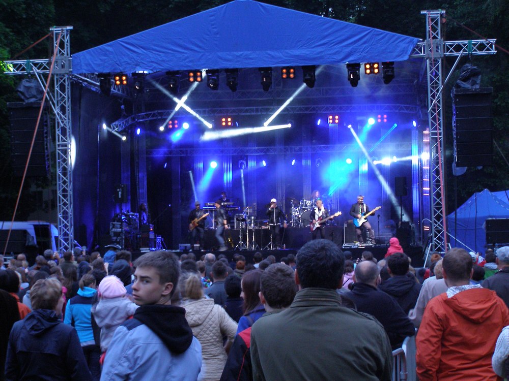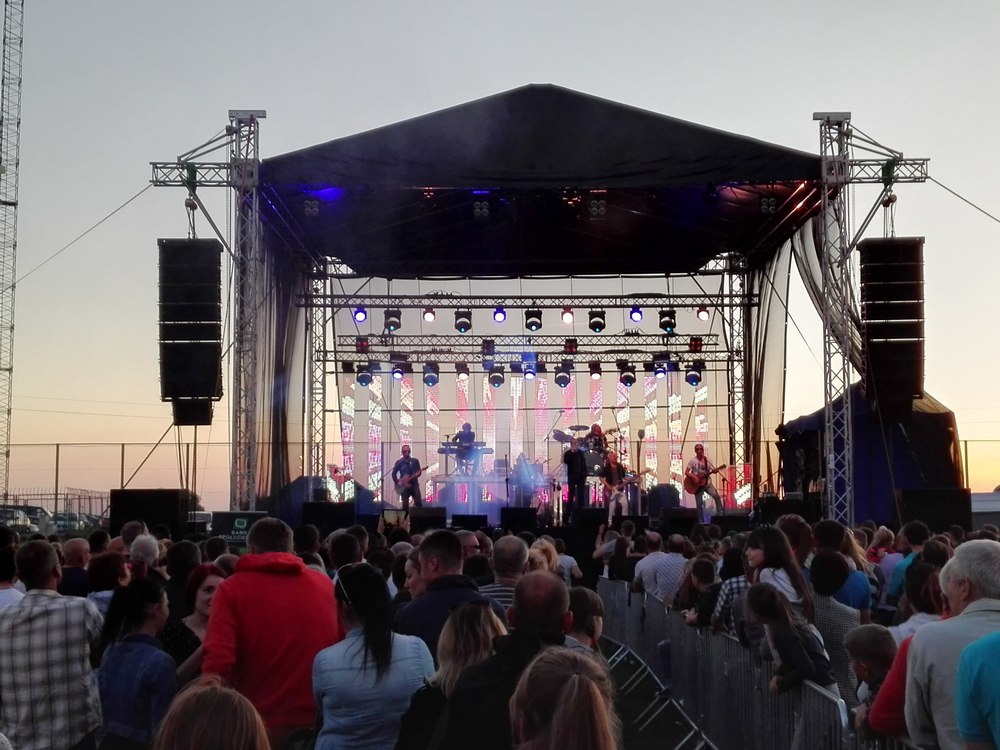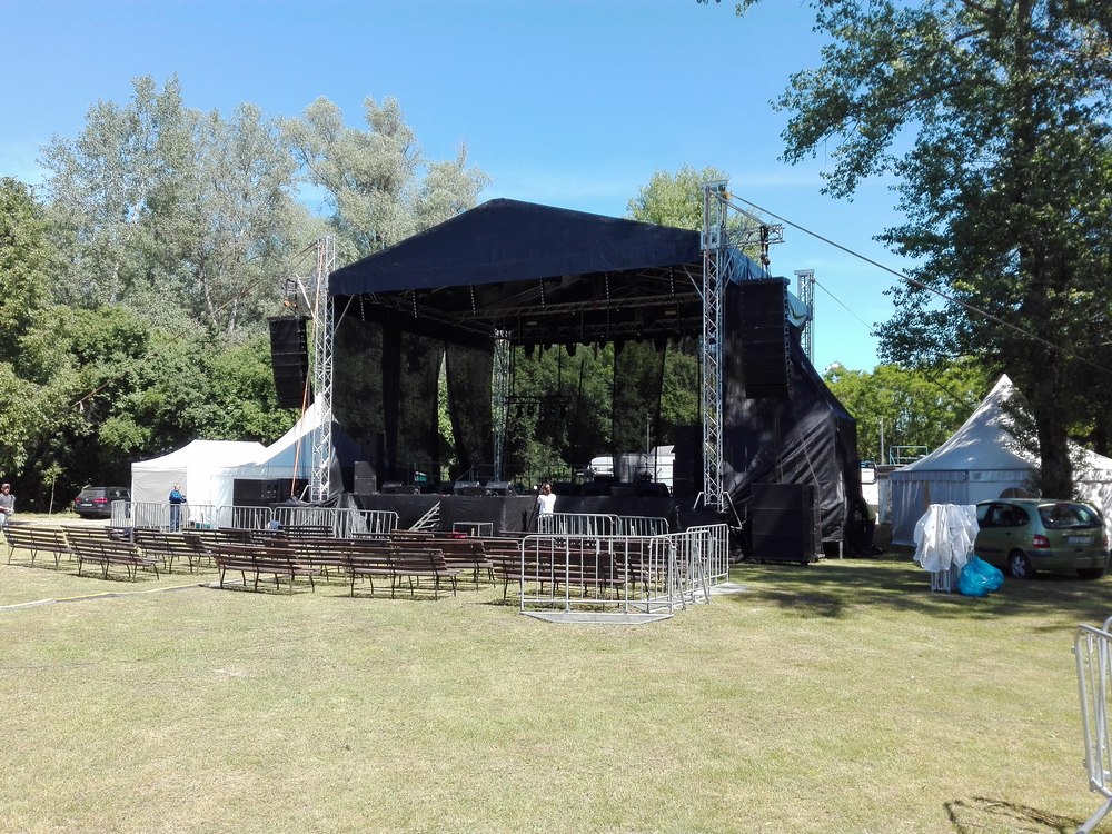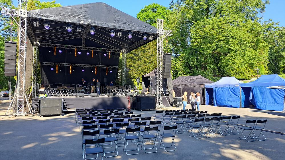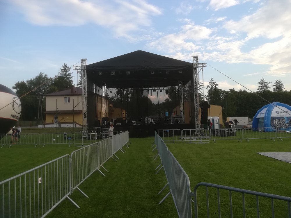 Budujemy imponujące sceny dla eventów i koncertów. 100m2 podłogi antypoślizgowej z zadaszeniem w kolorze czarnym lub niebieskim, zadaszenie posiada 3 ściany z atestowanej czarnej siatki + schody przegubowe z 2 stron. Skontaktuj się, by stworzyć niezapomniane wrażenia!