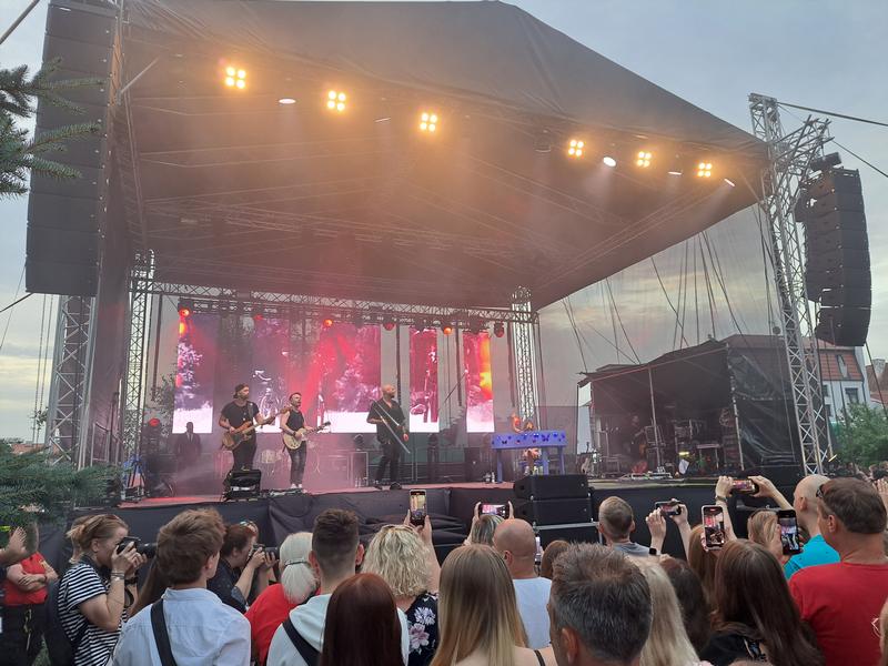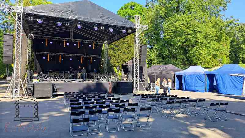 Zaprojektowana na średnie imprezy i koncerty plenerowe. Zadaszenie dwuspadowe w kolorze czarnym, jest świetną alternatywą dla wszystkich, którzy mają w planach organizację imprezy pod gołym niebem, Zapraszamy do wypożyczania kopletnych zestawów scen, kilka foto z realizacji scenicznych poniżej